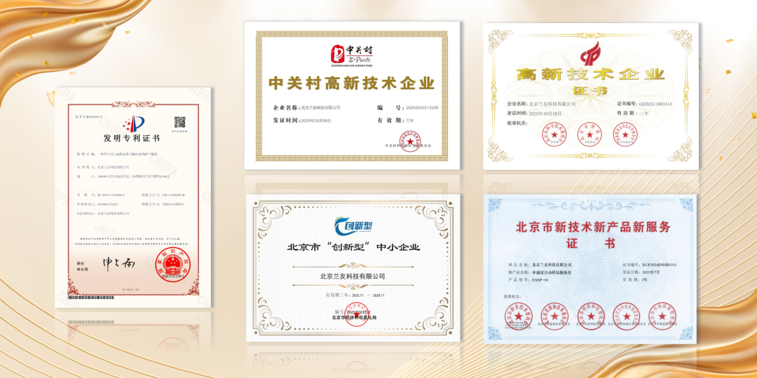2025年,兰友科技先后获得北京市新技术新产品(服务)证书、北京市科技型中小企业证书、北京市“创新型”中小企业证书、中关村高新技术企业证书以及国家高新技术企业证书、北京企业评价协会科技创新优秀奖等荣誉资质,并获得2025年海淀区科技中小企业创新发展专项资金和2025年国家高新技术企业“筑基扩容”专项资金支持,企业实力获得官方认可。